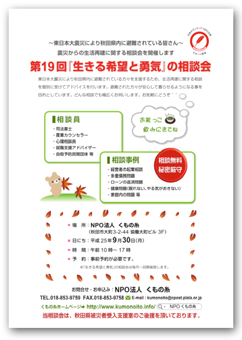 秋田市保健所の協力を得て、秋田市災害防災課から避難者へ開催日程を連絡するという形で啓発活動を行った。最初は、避難者にとって当法人の知名度が低い事、避難者自身が県外からの移住で落ち着かないこともあって相談に訪れる人は少なかった。その後、直木賞作家西木正明氏の文化講演会や、秋田市セリオンにて開催した「生きる希望と勇気」シンポジウムで、秋田県の救援物資、神戸「フェリシモ」や地元スーパー「伊徳」などの衣料品の支給を行い避難者への知名度は急速に浸透していった。